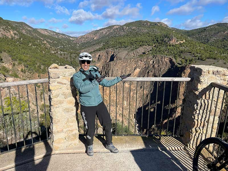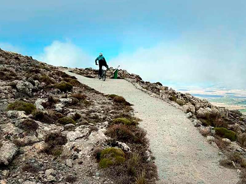 La ascensión final al Mirador de Piedra Lobera y luego al Vértice tiene esa mezcla de dureza noble: rampas muy fuertes pero todo pista y asfalto, sin trampa técnica. El viento nos daba latigazos de lado y nos reíamos a gritos para no volar. En la cumbre, tú y el 360º del Almanzora: Filabres allá, Estancias acá, un mar de sierras y el valle como maqueta. La tradición cuenta que por estas riscas cayeron los últimos lobos de la sierra. Hoy la peña ruge con molinos a lo lejos.